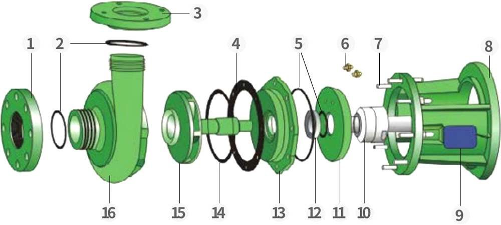 کارخانه ما در ساخت پمپ های گریز از مرکز و خود پراینگ تمام پلاستیکی مقاوم در برابر خوردگی در دو ماده - PVDF و FRPP - در چهار سری (FV، FP، FVZ، FPZ) تخصص دارد. پمپهای PVDF برای جابجایی اسیدهای قوی، اکسیدانهای قوی، هالوژنها، هیدروکربنهای معطر، ترکیبات آلیفاتیک و حلالهای کلردار با محدوده دمایی ۴۰- تا ۱۴۰ درجه سانتیگراد مناسب هستند. پمپهای FRPP برای قلیاییهای قوی و همچنین اسیدها، بازها، نمکها و مشتقات عمومی آنها با محدوده دمایی -40 تا 90 درجه سانتیگراد ایدهآل هستند. پمپ ها معمولاً توسط موتورهای نوع Y کم مصرف هدایت می شوند. موتورهای ضد انفجار در صورت درخواست قابل ارائه هستند.